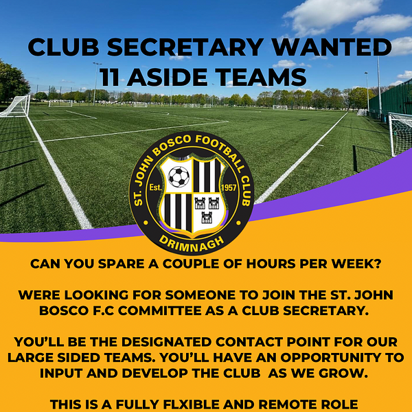 We’re looking for a volunteer to join the St. John Bosco F.C committee as a club secretary for our 11 aside teams.